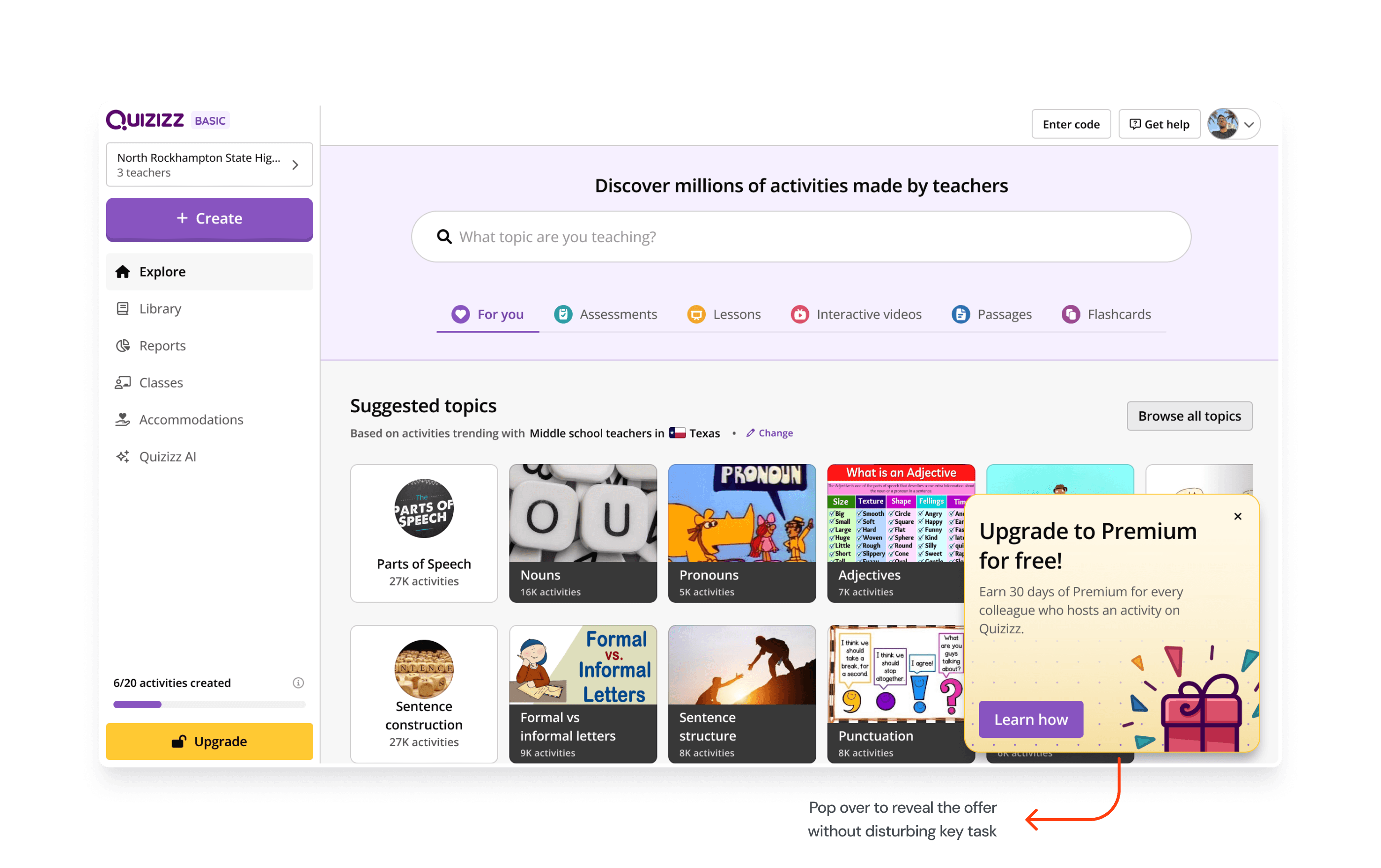 We designed referral nudges around the “magical 5” teacher mark. For schools close to the mark, rewards required higher commitment (e.g., hosting a quiz). For schools with fewer teachers, rewards were simpler to unlock (just a sign-up). We tested cash incentives against free trials to compare impact. To drive adoption, referral prompts were placed at key paywall moments, making actions seamless.